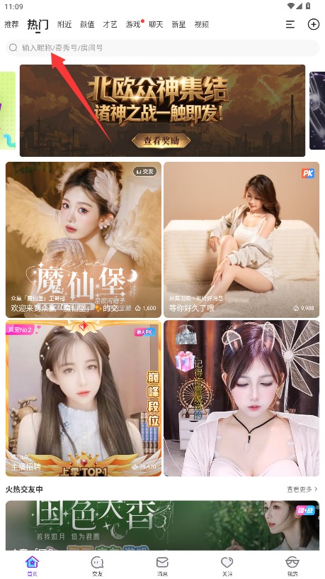 3、在首页搜索栏输入昵称、奇秀号或房间号,系统将智能匹配并展示对应的直播内容。