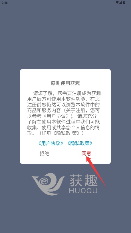 1、首次启动需查看用户协议与隐私条款,确认内容后点击同意选项进入应用主界面。