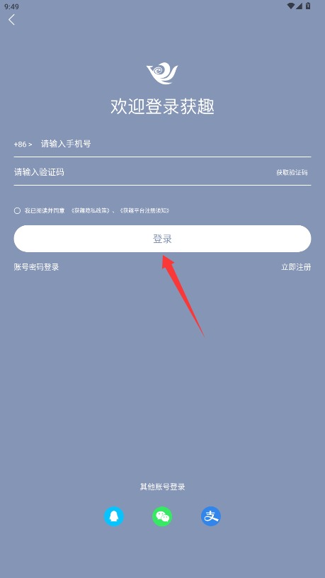 3、输入注册手机号并填写收到的验证码,勾选服务协议后点击登录按钮进入系统。