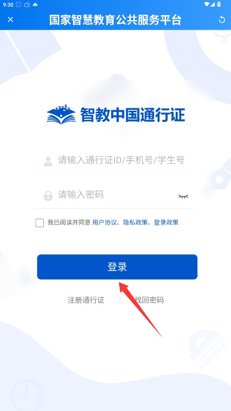 3、输入通行证ID、手机号或学生号并填写密码,勾选服务协议后点击登录完成进入系统。