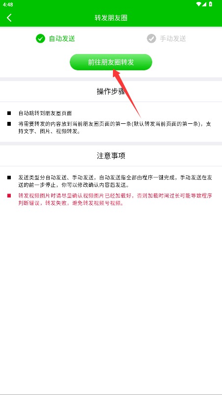 3、根据需求选择智能自动转发或手动编辑模式,确认后点击前往朋友圈转发操作。