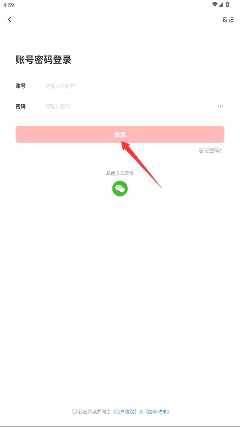 1、登录时填写手机号与密码,勾选用户协议后点击登录按钮,也可选择微信快捷登录。