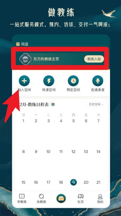 2. 切换到做教练页面,可加入教练空间、快速预约教练时间,并支持在线录音记录。