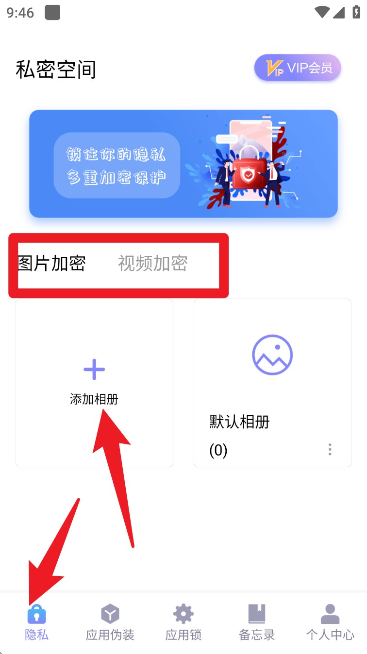 2. 进入底部菜单隐私页签,点击添加相册可将想要隐藏的图片加密储存。