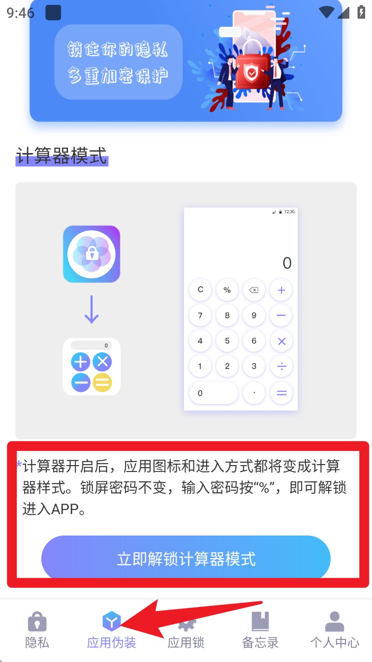 3. 切换到应用伪装功能,将 App 图标伪装成计算器,输入密码再按%即可解锁。