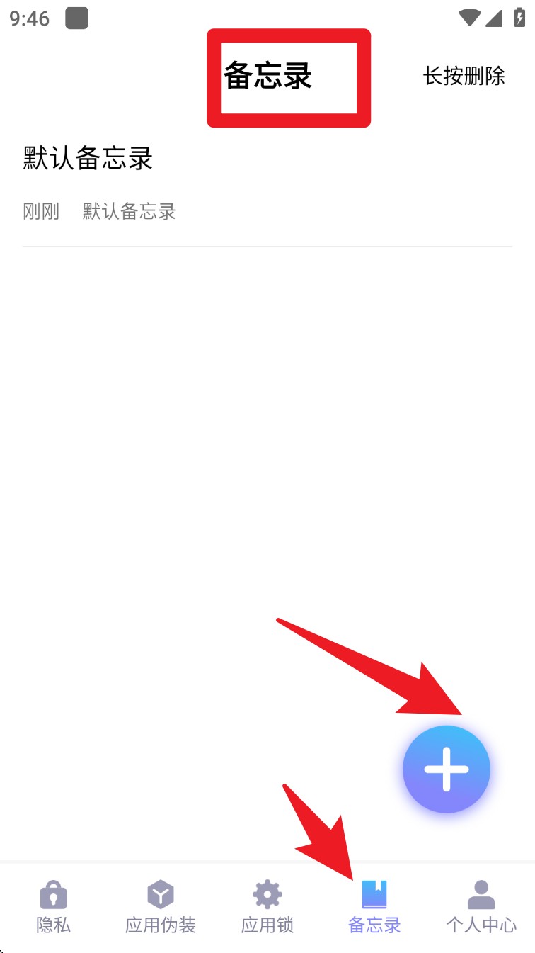 4. 使用备忘录功能可创建隐私笔记,点击右下角+号即可新增记录,便于管理。