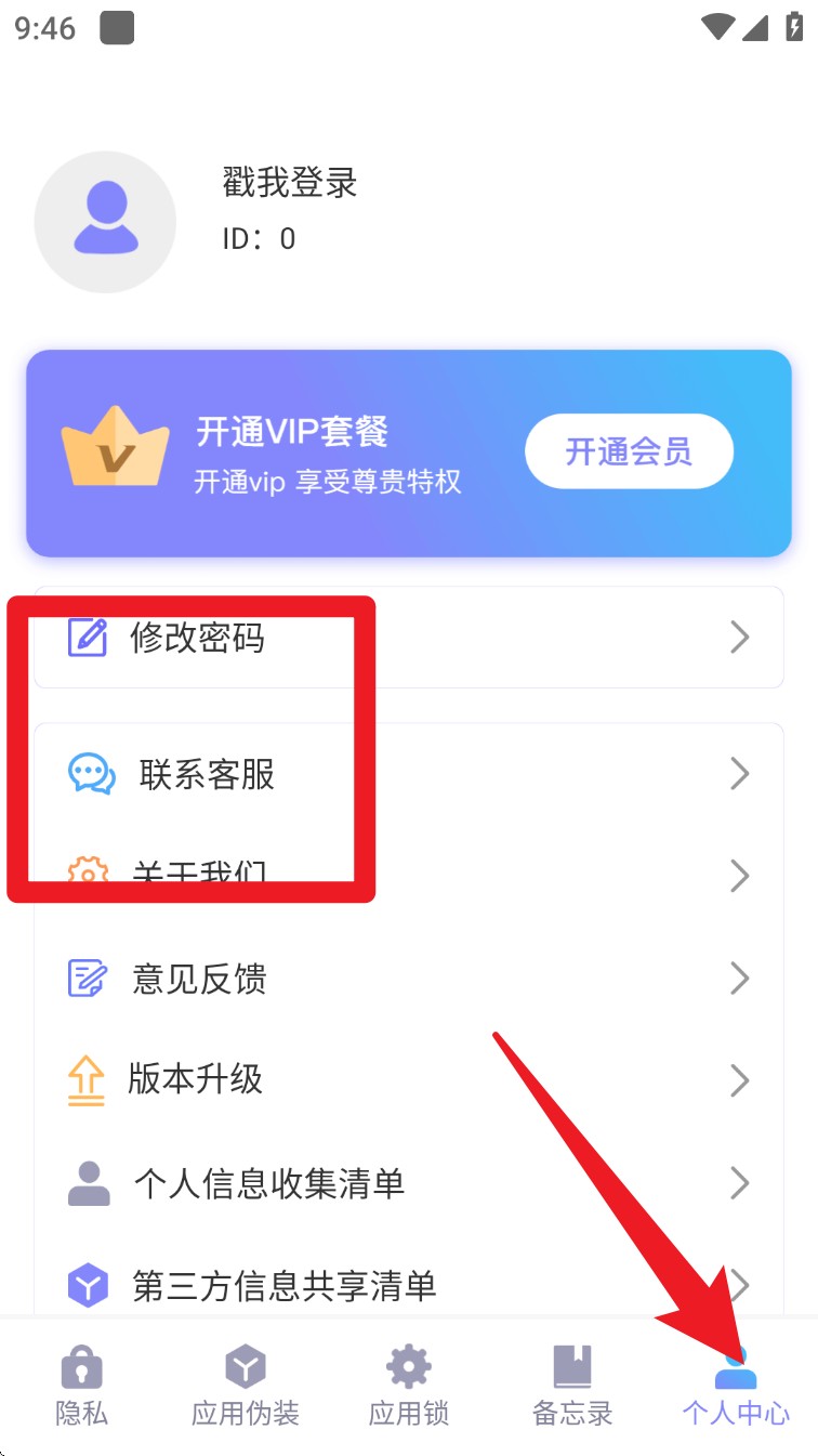 5. 在个人中心中可修改密码、联系客服或查看版本信息,也能随时管理个人数据。