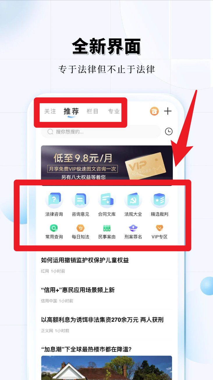1. 进入首页点击上方推荐或专业等标签页,可浏览法律咨询、合同文库、精选判例等分类内容。