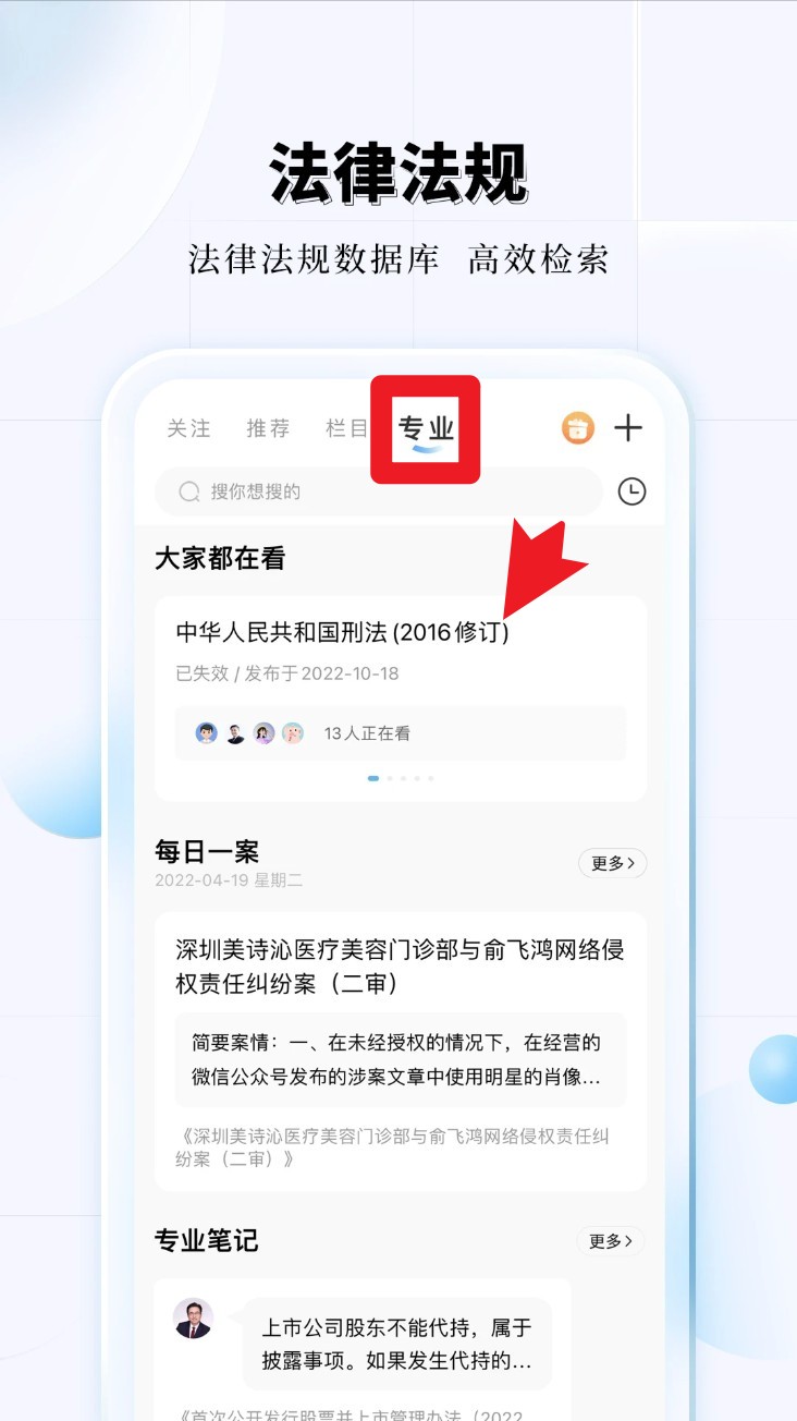 2. 在专业页签中可快速查看热门法规、法条解析与每日案例,支持关键词搜索定位条文原文。