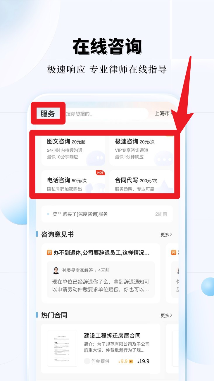 3. 切换至服务页面,可选择图文咨询、电话咨询、合同代写等服务,根据需求联系专业律师。