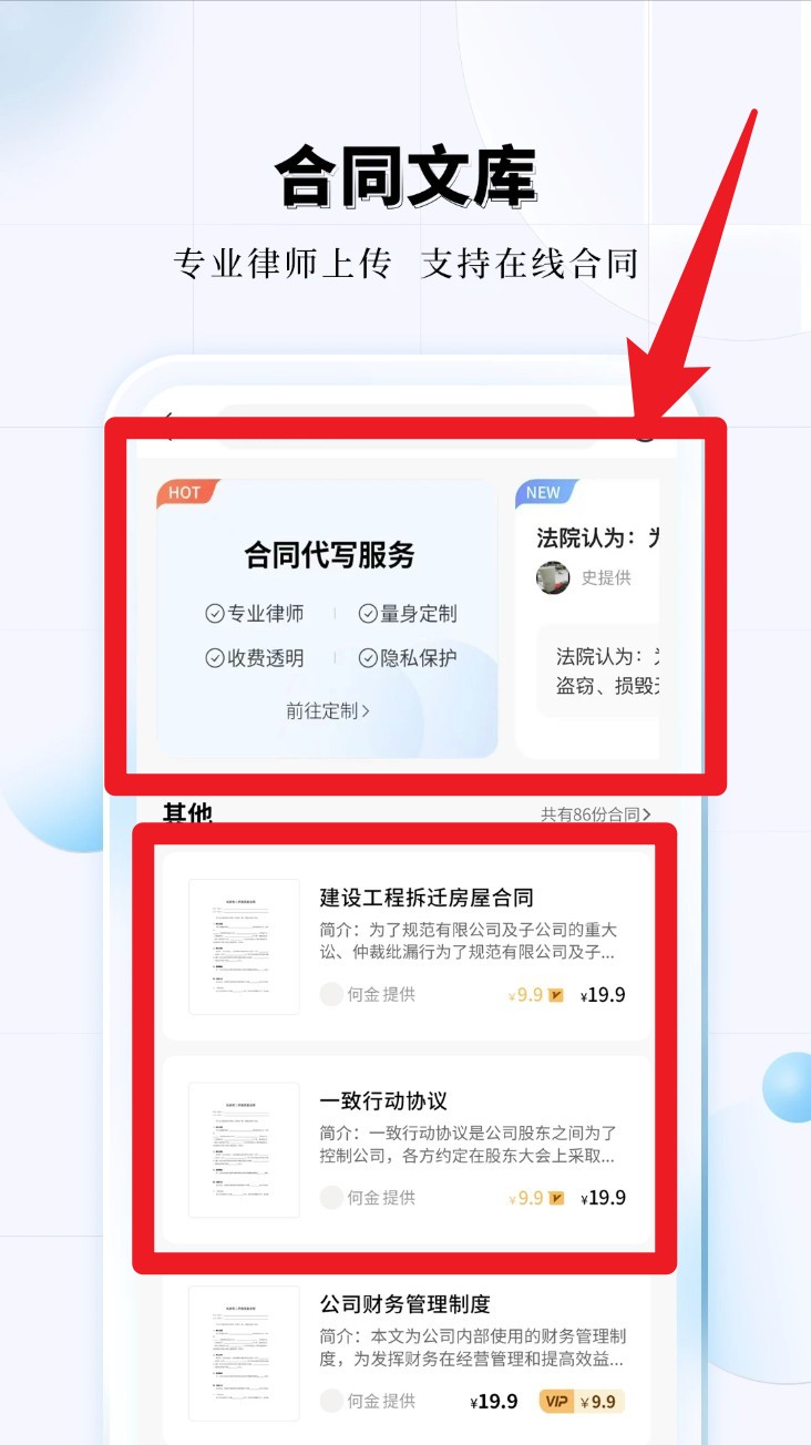 4. 进入合同文库模块后,可浏览各类专业合同范本,支持查看简介、付费下载与在线定制服务。