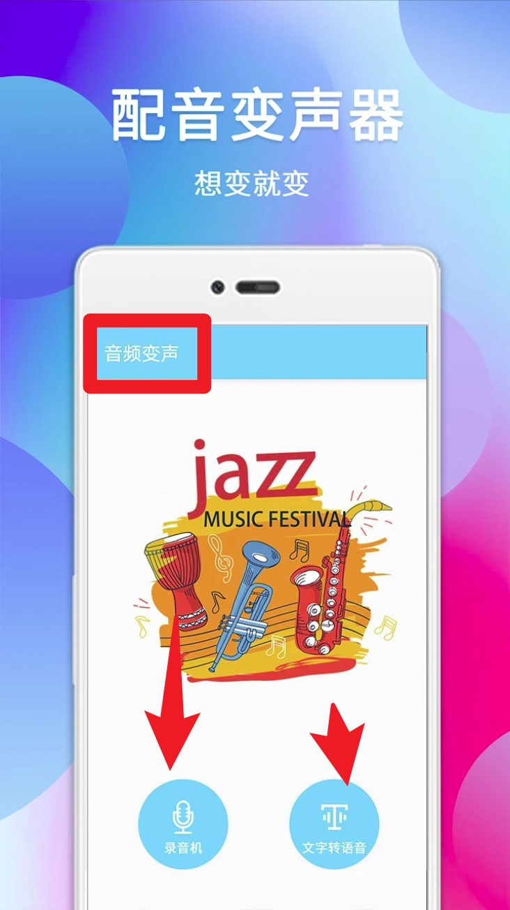 1. 进入首页点击音频变声,选择录音机或文字转语音,即可开始制作音频内容。