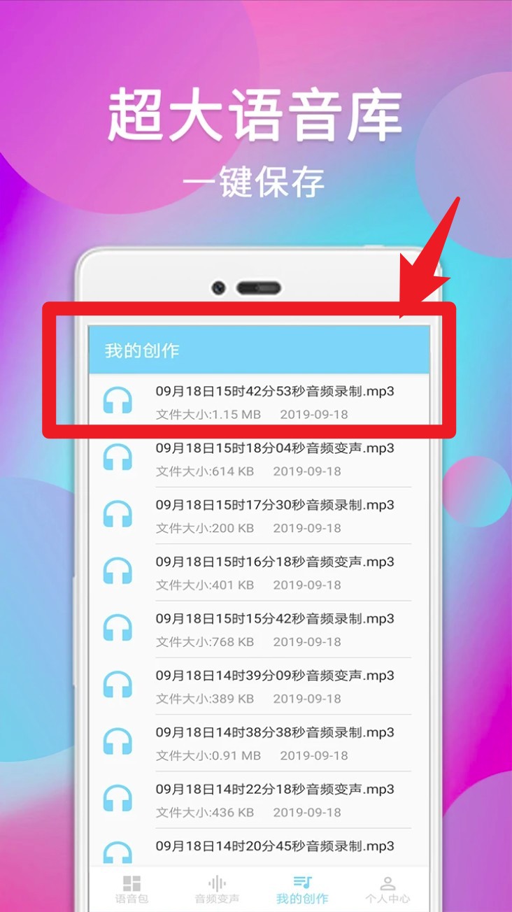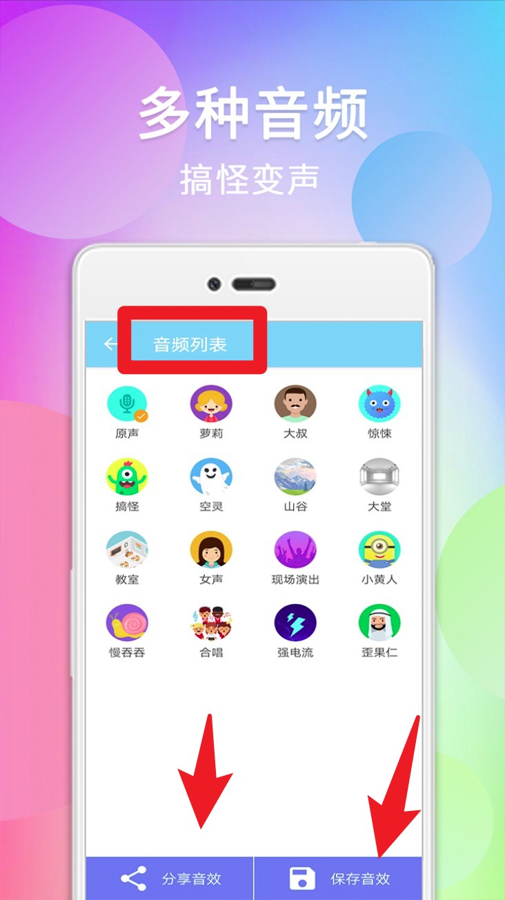 2. 录音完成后跳转到音频列表,可浏览多种语音模板并实时试听变声效果。