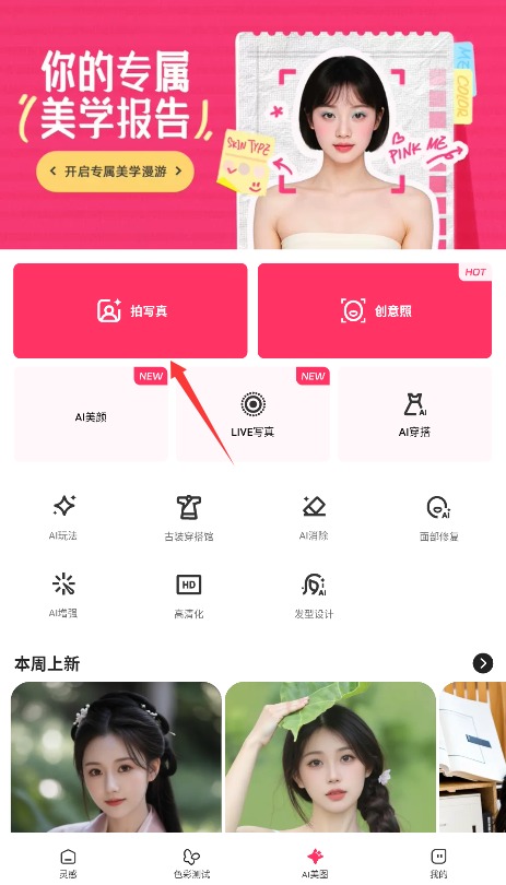 3、在AI美图功能界面选择拍写真,上传个人照片即可开始智能美化处理。