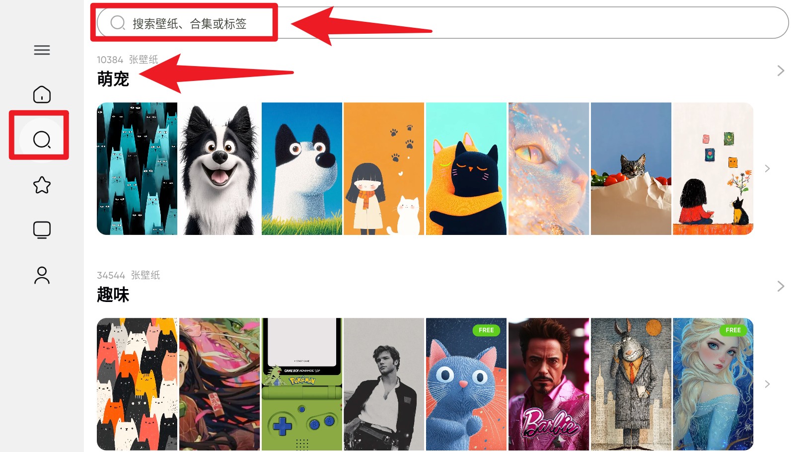 2. 点击左侧放大镜图标或顶部搜索框,可输入关键词如宇宙、猫咪等快速筛选主题壁纸集合。