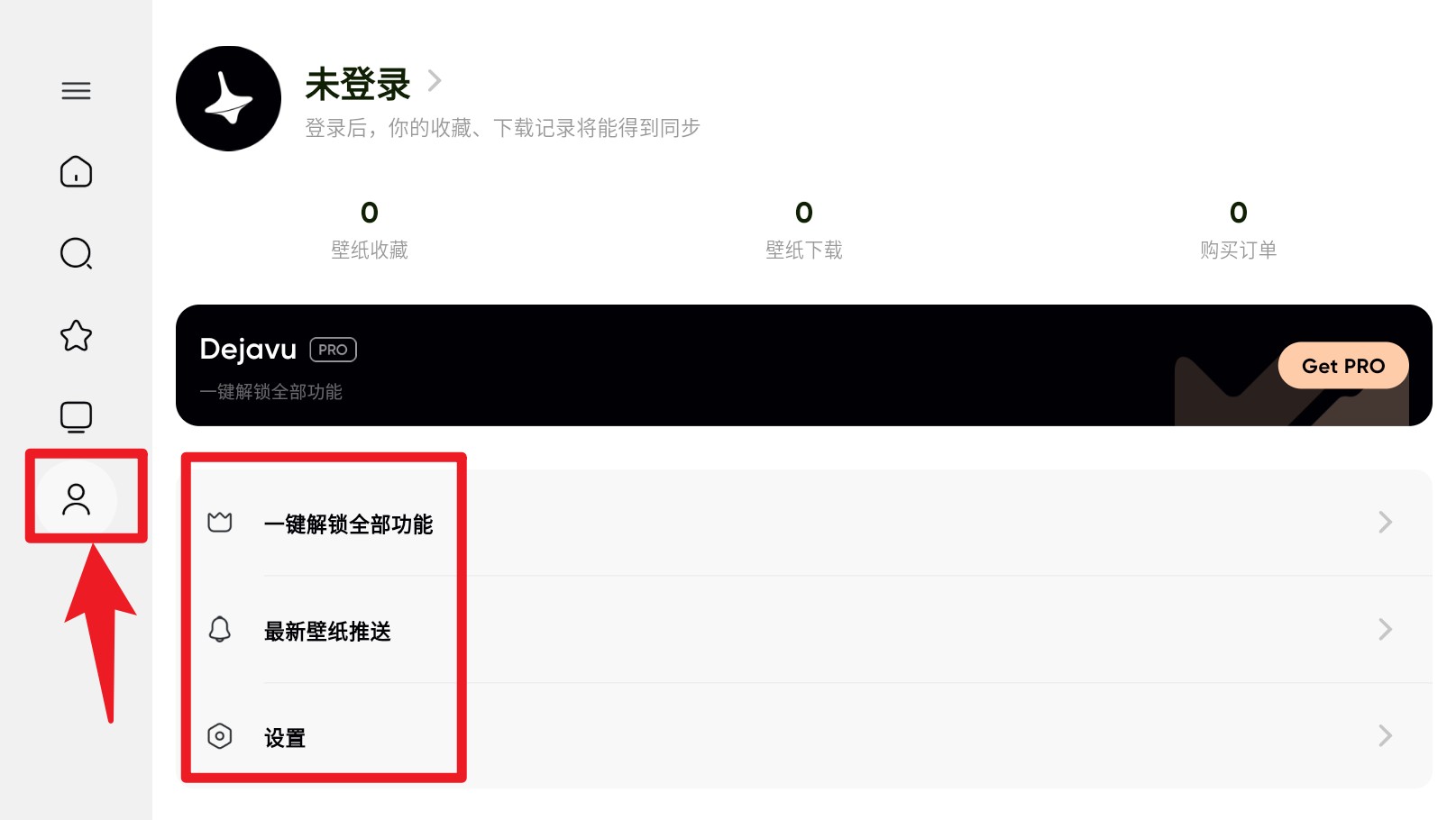 4. 点选左侧个人中心图标,可解锁全部功能、开启壁纸推送服务,并进行账户登录或偏好设置。