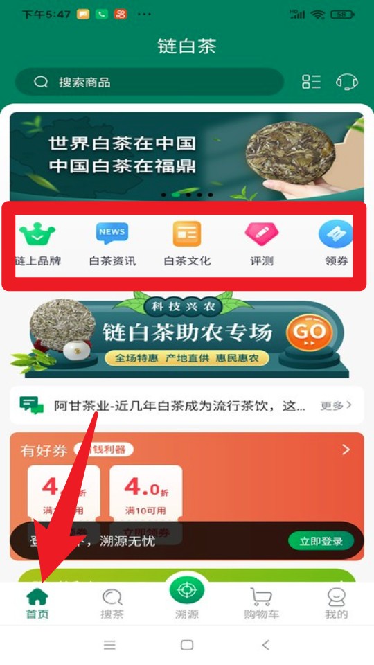 1. 打开App之后,点击首页中的链上品牌、白茶资讯等模块,快速浏览产业信息、白茶文化与专属福利。