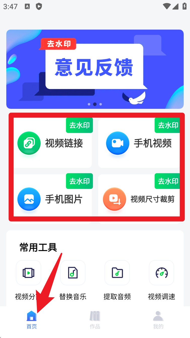 1. 进入首页后,可选择视频链接、手机视频、手机图片等方式导入素材,点击图标即可开始去水印处理。