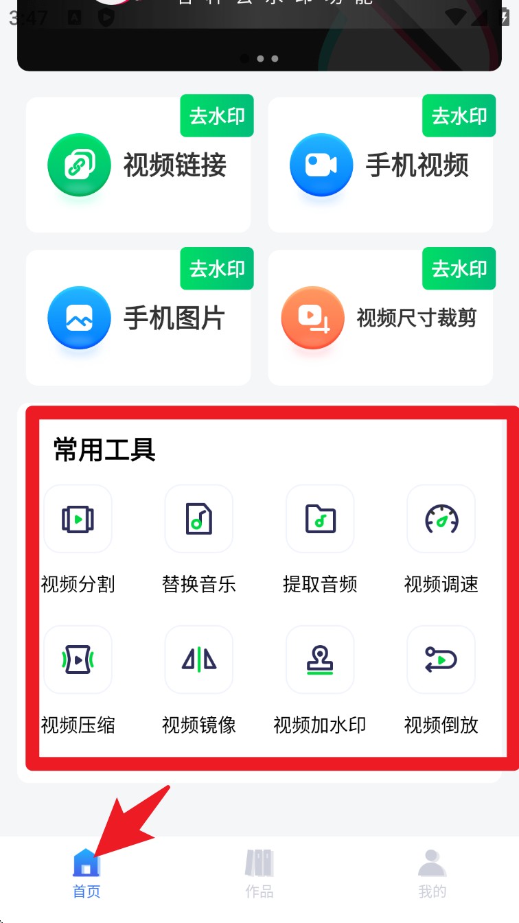 2. 往下滑动可使用常用工具,如视频分割、替换音乐、视频加水印等,全部都能直接点击使用。