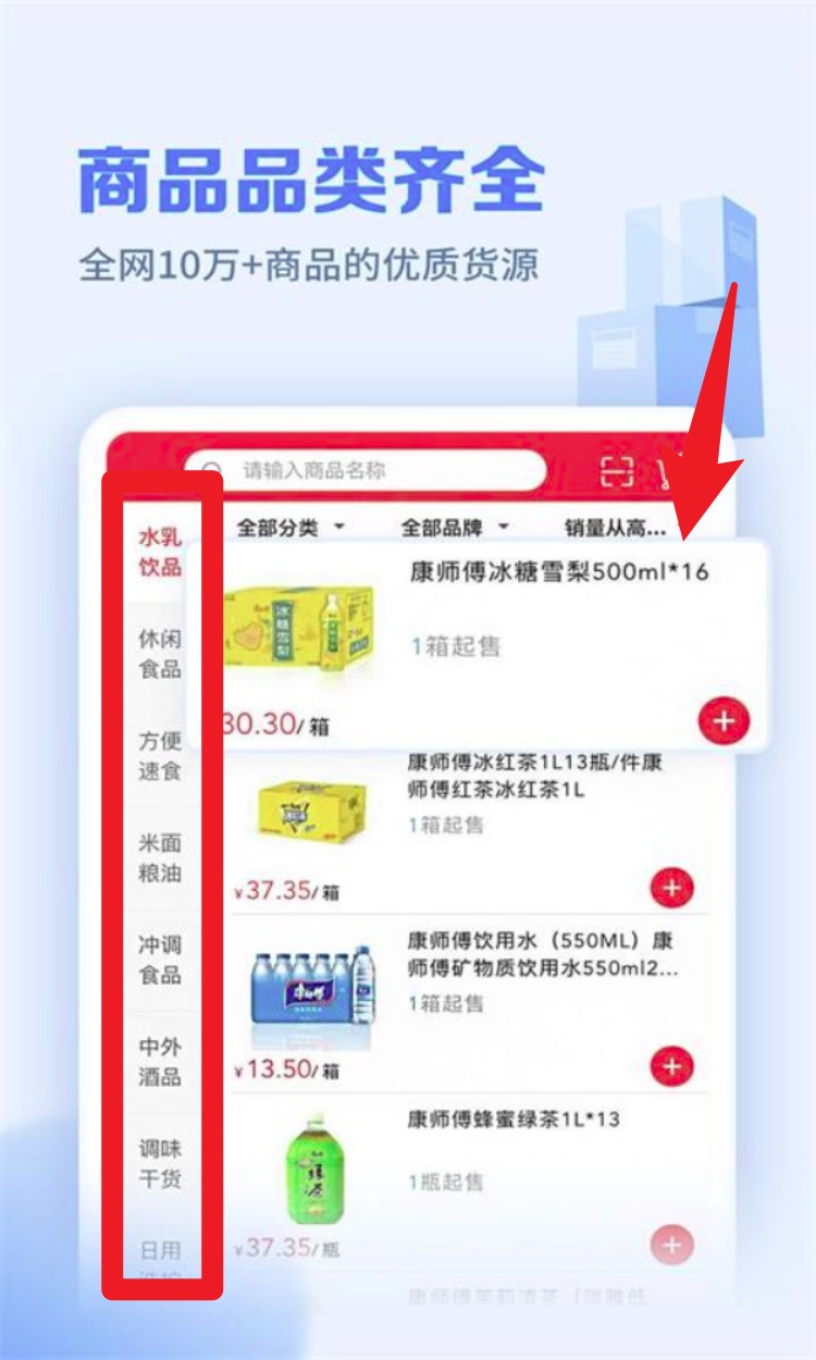 2. 进货时可从商品分类中选择品类,点击右侧+即可快速加入购物车。