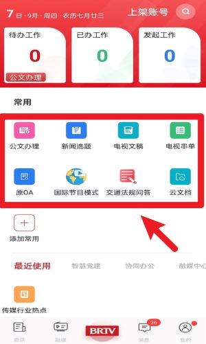 2、首页常用功能包含公文处理、新闻选题、电视文稿等高频工具,可根据岗位需求添加更多常用快捷入口。