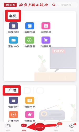 3、进入融媒栏目后,可分别查看电视和广播两个内容板块,涵盖文稿、申单、素材及传播效果等操作。
