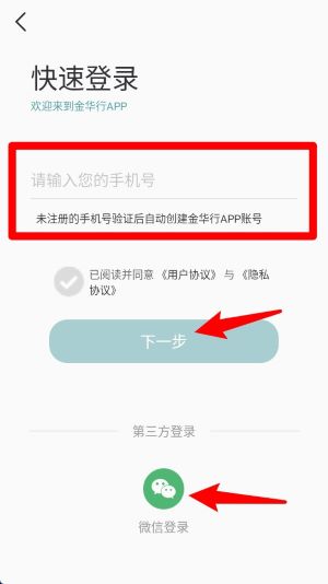 1、打开app,用户可通过输入手机号或微信授权方式登录金华行APP,首次登录将自动创建账号。