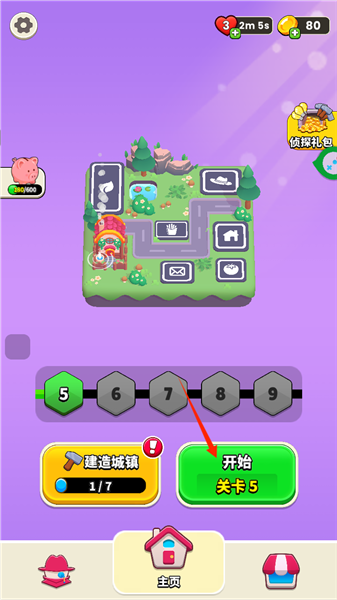 7、点击首页的建造城镇,通过闯关获得锤子建造城镇。