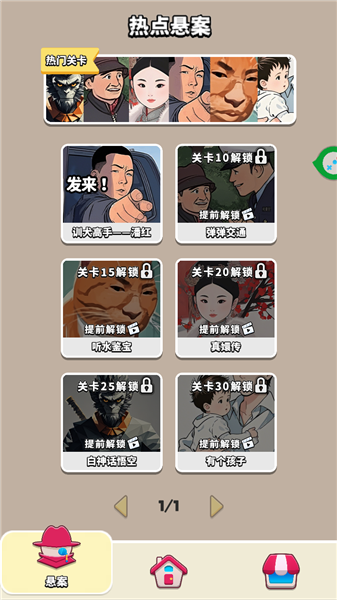 9、点击左下角的悬案,可以游玩通关关卡解锁的热点悬案。