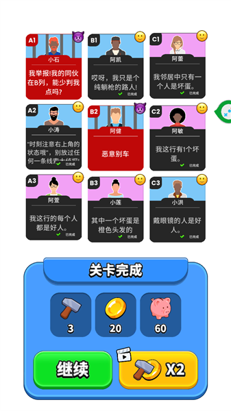 探案过程中,需制定专属推理策略,凭借严谨的逻辑思维逐步缩小嫌疑范围,最终精准定位卧底。是对智力的直接考验,更要求具备灵活应变的能力与前瞻性的策略规划思维,每一步决策都关乎探案成败。