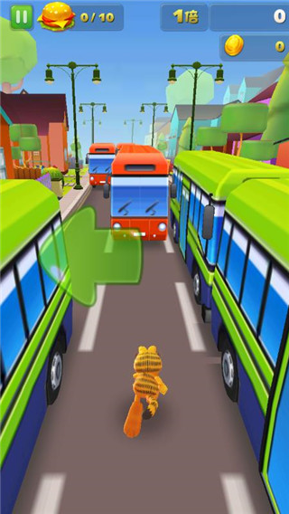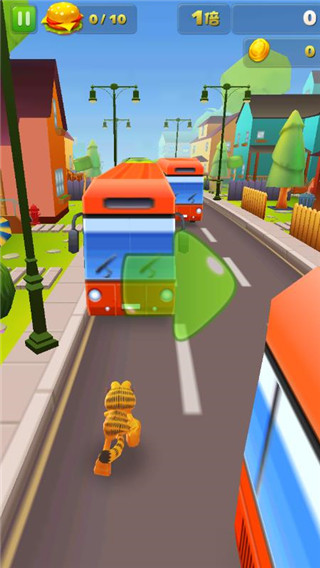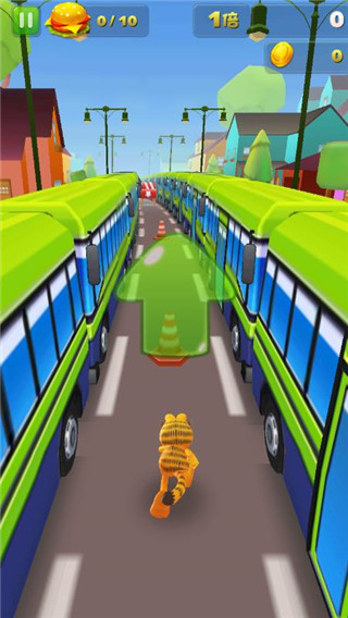 3.需控制加菲猫在广阔赛道上灵活左突右闪,在躲避各类危机的同时,收集更多资源与装备。