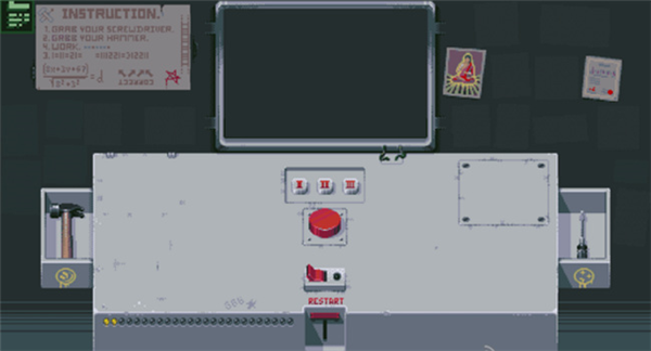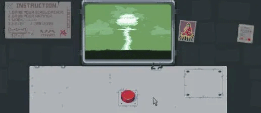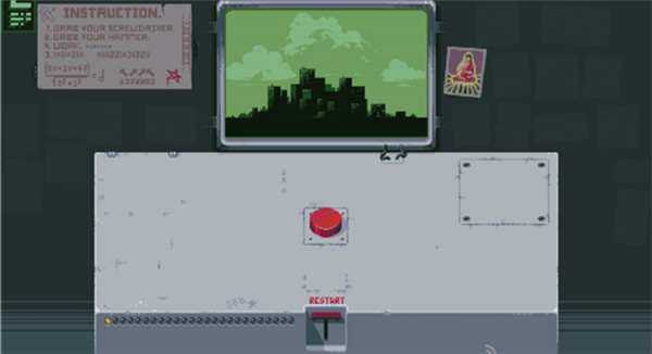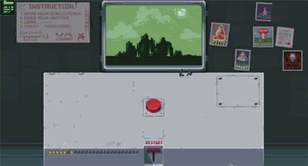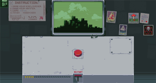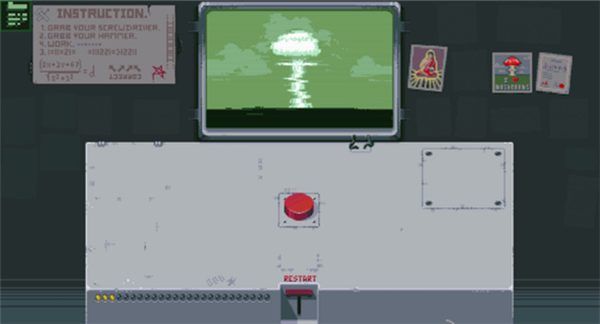 3.第三盏灯:先点击RESTART回到初始状态,在初始状态下点击一次红色按钮。然后会出现开关,这个时候点击一下开关,红灯亮起。再点击红色按钮,控制台的左侧会开始进入倒计时。最后屏幕出现原子弹爆炸的画面,然后就可以点亮第三盏灯了。