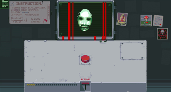 5.第五盏灯:首先我们根据以前得到的结局步骤,不停点击红色按钮,直到左侧抽屉弹出锤子为止。然后用锤子直接砸向控制台电脑的屏幕。屏幕裂开了,这个时候我们点击一下中间的按钮。看起来屏幕好像坏掉了,不过不用紧张。耐心的等待一会,机器就会重新启动。重启完成后第五盏灯就点亮了。