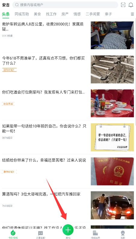 2、在首页底部点击中央的加号发帖功能,进入内容创作与发帖功能选择界面。