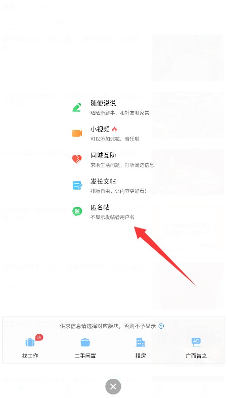 3、根据需求选择发帖类型,包括日常动态、视频分享、同城交流或长篇文章等格式。