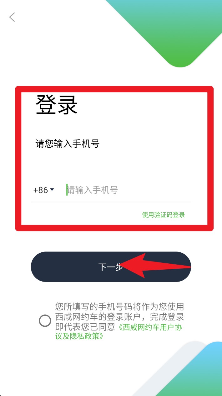 1. 打开App输入手机号码并点击下一步,完成验证码验证后即可登录平台使用服务。
