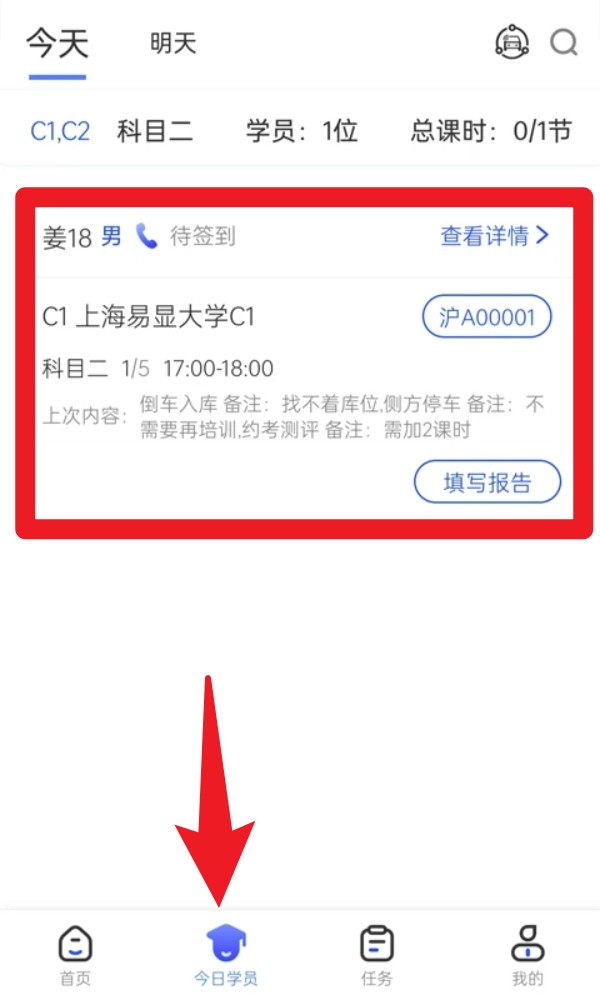 2. 点击今日学员标签页,可查看今日课程安排、学员签到状态、教学内容与备注说明。