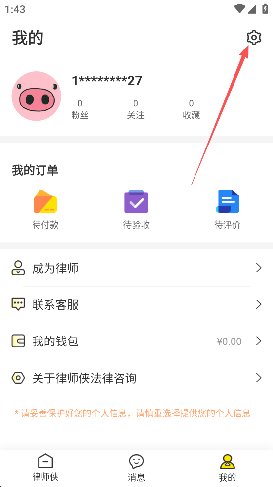 1、打开律师侠 App,在界面中找到并点击底部或顶部的【我的】入口,进入个人中心。