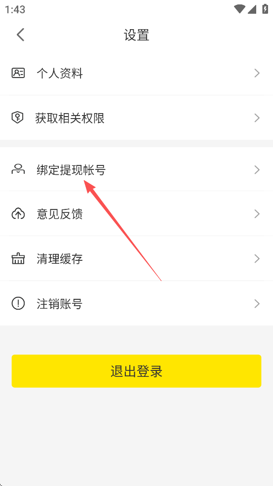 3、在设置界面中,选择【绑定提现账号】功能,进入账号绑定操作页面。