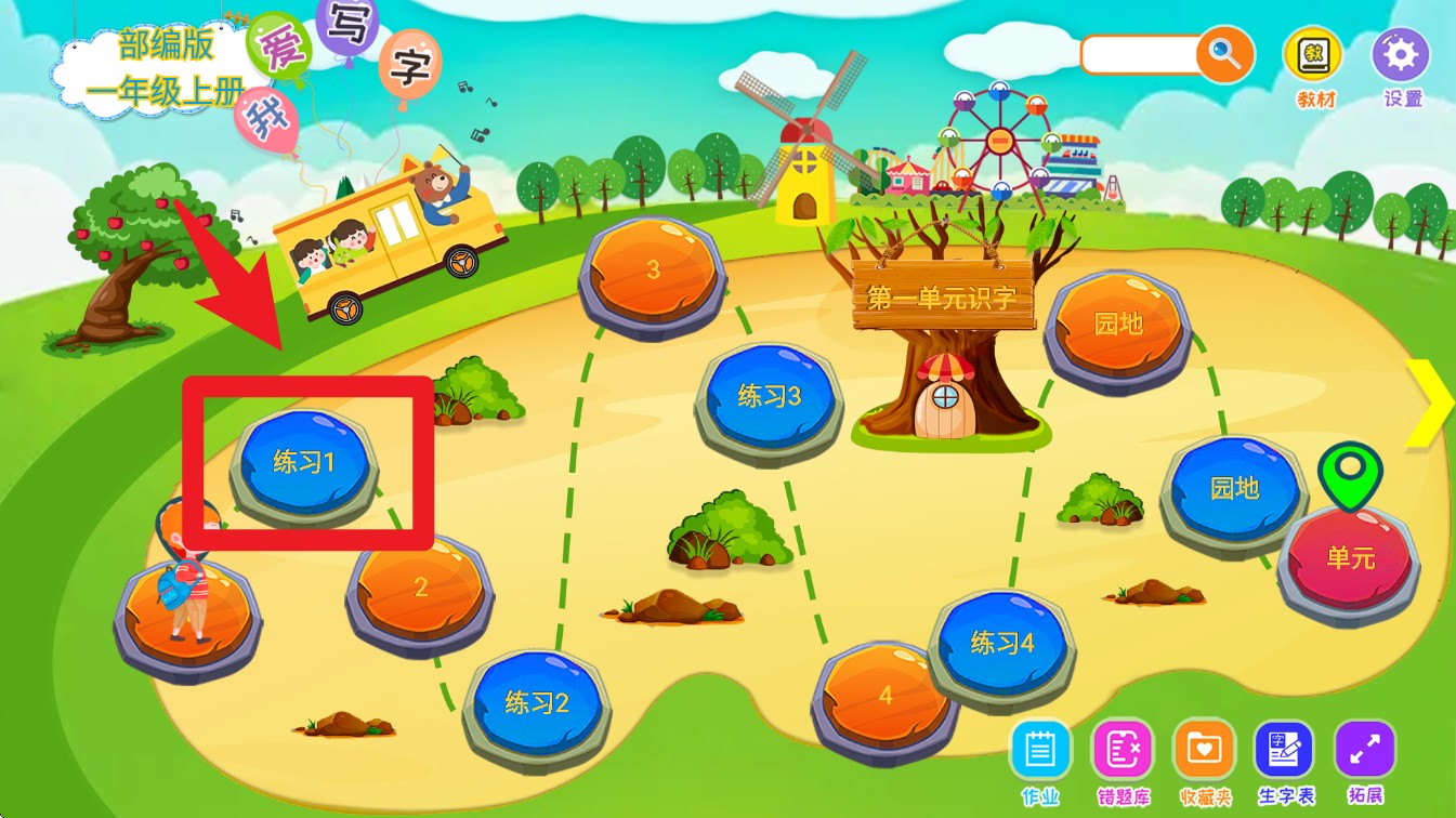 1. 进入首页后选择对应年级章节,点击练习1等关卡按钮可进入当前单元的学习任务。