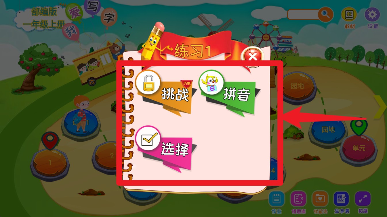 2. 在弹出的任务页中选择拼音、选择等练习模式,根据图标进入具体学习内容。