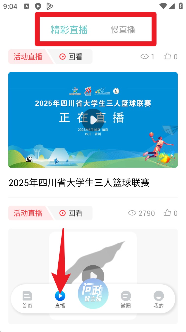 2. 切换到底部直播页面,点击正在直播的视频封面即可开始观看直播内容或活动回放。