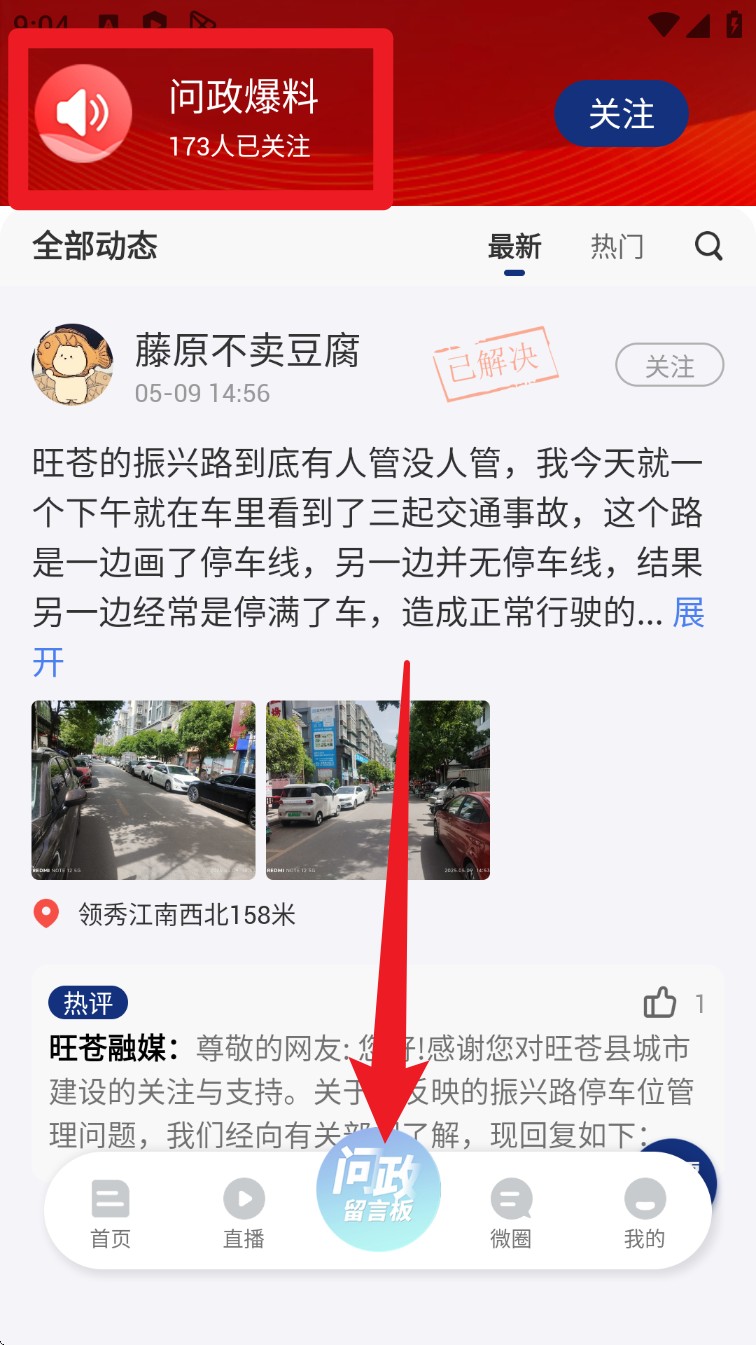 3. 点击底部问政按钮可进入爆料区,用户可以上传图片或文字反馈问题,官方会在此公开回复。
