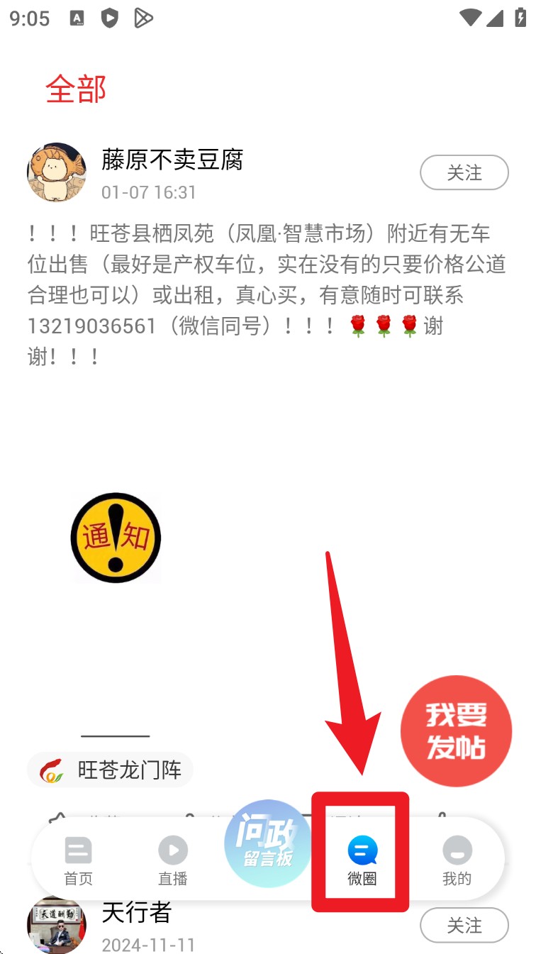 4. 进入微圈模块后可查看用户动态,点击右下角按钮即可进入发帖界面,自由发布内容互动。