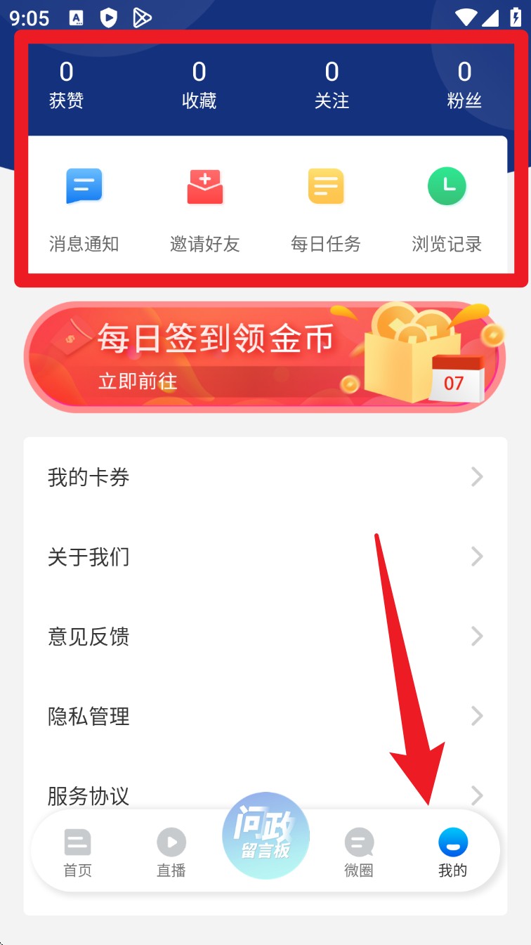 5. 点击我的页面可查看消息通知、收藏、粉丝等,还能参与每日任务,获取签到金币奖励。