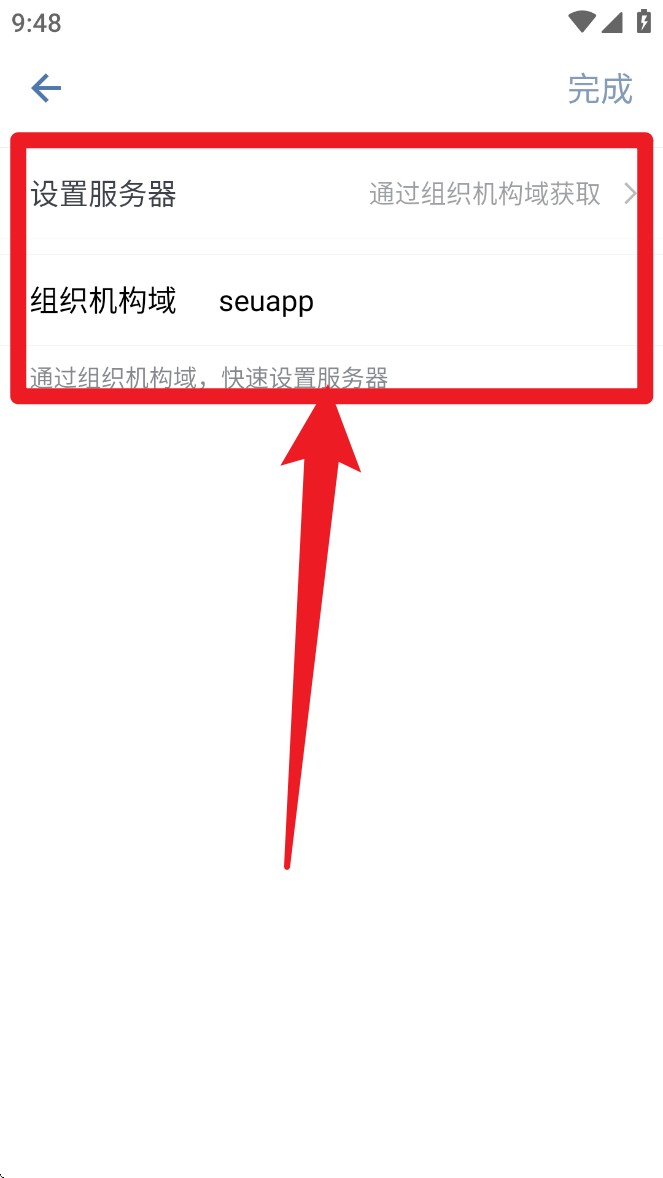 1. 启动App后进入设置页面,输入组织机构域名以完成服务器初始化配置。