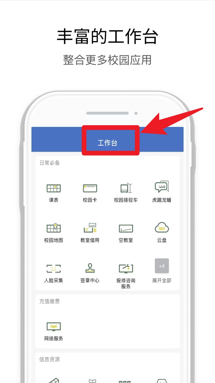 3. 登录成功后点击上方工作台入口,进入常用功能区,可查课表、借教室、报修等。