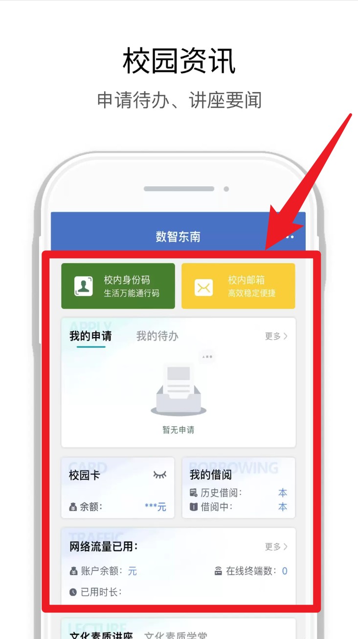 4. 切换到校园资讯页签可查看校内通知、办事申请、邮箱服务与校园卡余额等信息。