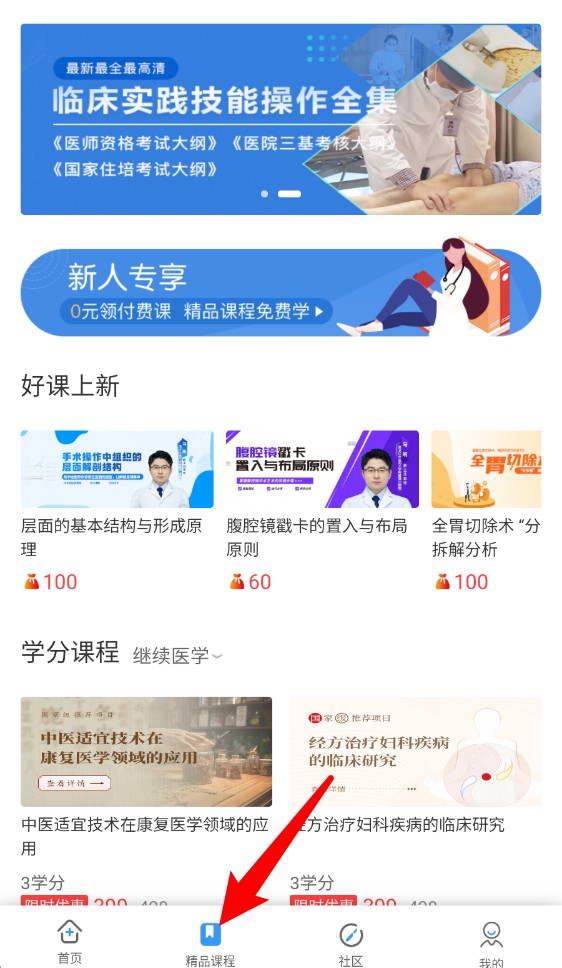 2.精品课程专区收录临床技能、资格考试等精品教学资源,新用户可免费领取学习内容。