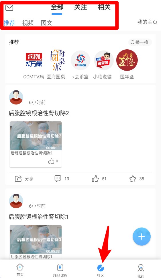 3.社区板块聚合视频、图文等动态内容,支持关注与推荐查看,便于同行互动与交流。